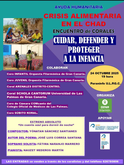 Honrados y satisfechos con nuestra actuación en el Paraninfo de la ULPGC, en el marco del Encuentro de Corales que, bajo el lema "Cuidar, defender y proteger a la infancia", organizó la ONG OXFAM INTERMON con el apoyo de la propia Universidad. Fue un evento artístico muy diverso y ameno en el que primó la llamada a la defensa de la infancia en todo el mundo.